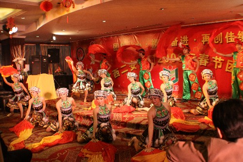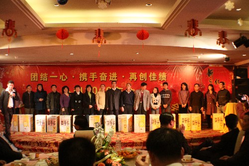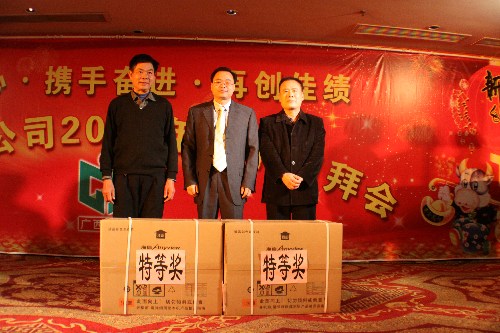 春節團拜會員工文藝表演精彩紛呈 歌舞飛揚讓您目不暇接 春節團拜會上公司董事長黃鼎龍(中)給抽中特等獎的員工發獎并合影留念 精彩表演讓大家樂開了懷! 排隊領獎陣容龐大! 共同舉杯祝福明天更美好!